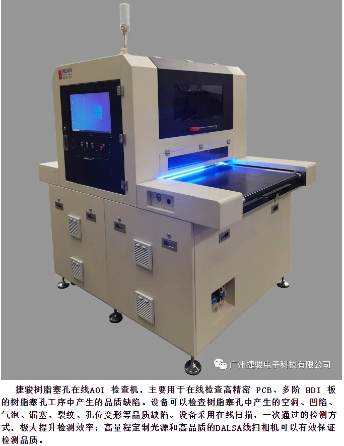 導(dǎo)語:捷駿最新研發(fā)的樹脂塞孔在線AOI 檢查機(jī),主要用于在線檢查高精密 PCB、多階 HDI 板的樹脂塞孔工序中產(chǎn)生的品質(zhì)缺陷。設(shè)備可以檢查樹脂塞孔中產(chǎn)生的空洞、凹陷、氣泡、漏塞、裂紋、孔位變形等品質(zhì)缺陷。