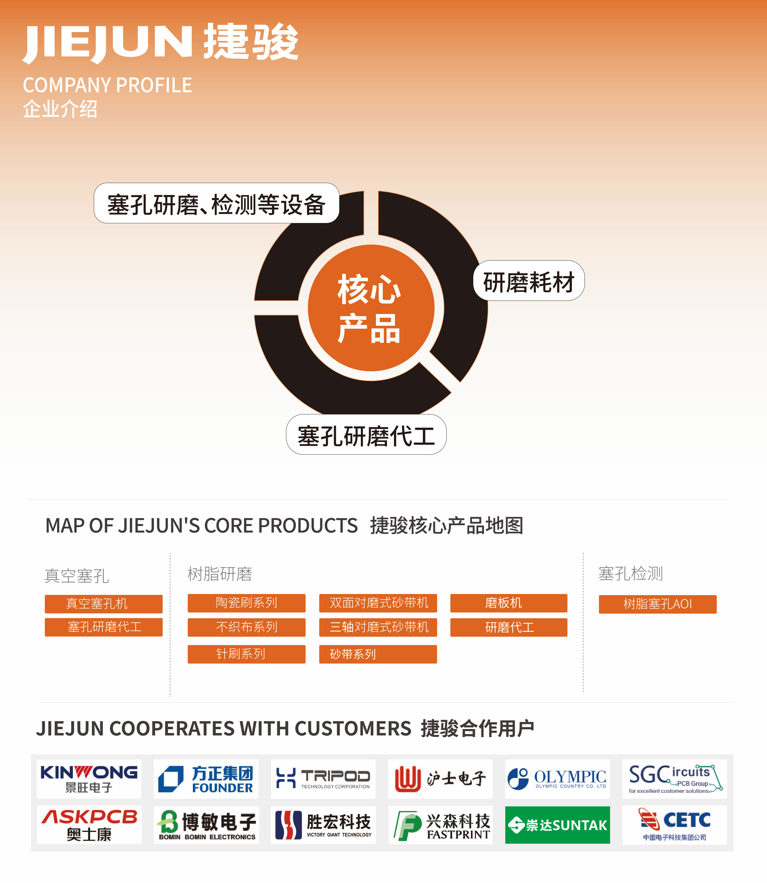 廣東捷駿電子科技有限公司,在廣州捷駿的基礎上成立于2018年。經過多年的不懈努力,逐步成長為以真空塞孔研磨檢測設備、研磨耗材、真空塞孔代工為支柱的綜合型公司。公司集專業(yè)制造、自主研發(fā)、銷售為一體,取得多項SGS管理體系認證,獲得廣東省高新技術企業(yè)和專精特新中小企業(yè)證書。